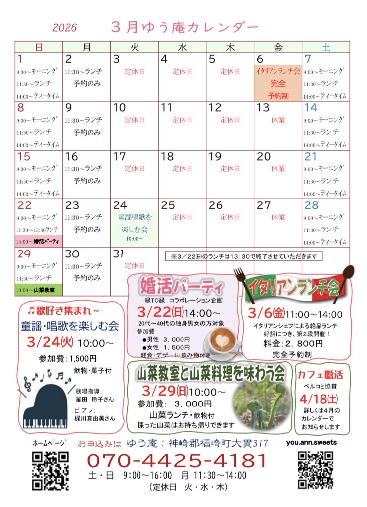 2026.3.2 / 最終更新日時 : 2026.3.2 you-an お知らせ 【2026年3月】ゆう庵の営業日とイベントのお知らせ ゆう庵からの最新情報 FacebooktwitterHatenaPocketCopy